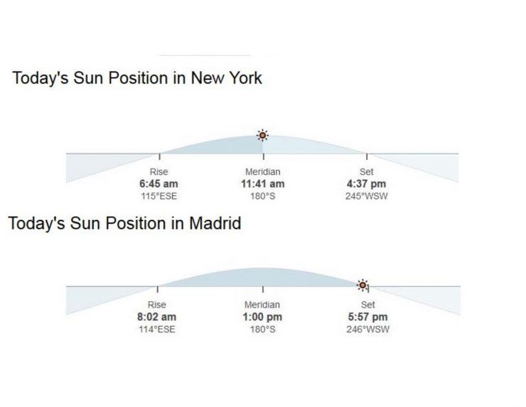 Now you understand why normal lunch time is at 12-1 pm in NYC and 2-3pm in Madrid, although they are in the same latitude or why people in Spain like to do thing so ‘late’. Actually, , according to sunlight, Spaniards are ones waking up earlier!