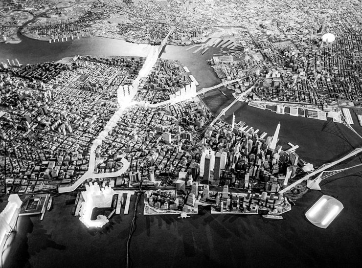 In a large and elongated room with the shape of Manhattan, the different exhibits where shown and located where they should have been built so the visitor can go through the space and see the jobs as he/she walks from Downtown to Uptown, just like moving by that imaginary but really proposed New York.