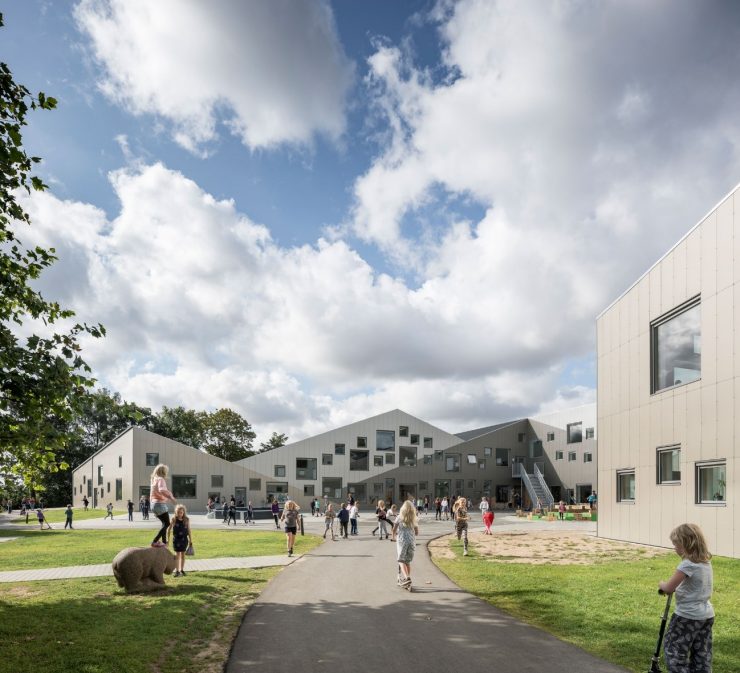 Following the Nordic building style which is focusing to take advantage of the space and also make a functional space, we found this wonderful school, formed by four fingers with 3 different yards.
