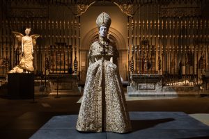 Providing an interpretative context for fashion’s engagement with Catholicism Heavenly Bodies exhibition has more than 150 ensembles, primarily womenswear, on view in the Byzantine and medieval galleries, in part of the Robert Lehman Wing, and at The Met Cloisters alongside medieval art from The Met collection. The presentation situates these designs within the broader context of religious artistic production to analyze their connection to the historiography of material Christianity and their contribution to the construction of the Catholic imagination.