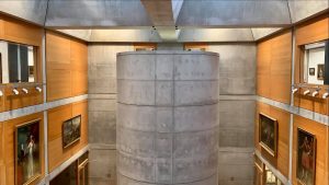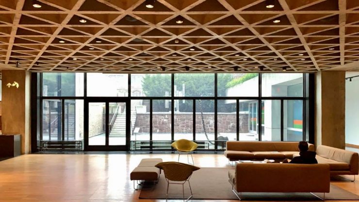 In first place we checked on two outstanding buildings, one being the Yale Center for British Art, known as one of Kahn’s last projects, and the other the Yale University Art Gallery, both designed by the american architect Louis I. Kahn. In spite of having an austere appearance on the exterior, the Yale Center for British Art has a geometrical floor plan designed around two courtyards, where the presence of natural light is enhanced in an impressive way. Louis I. Kahn mastered a diffused natural light in the different intimate galleries around the courtyards. Some of the elements that captured my attention here were the wood sliding shutters that filter the light during the day, the walls or panels dividing the galleries that didn’t touch the floor or ceiling, as well as the convex ceiling of glass used not only on the galleries but also on the stairways. I felt mesmerized with the details one can find in Louis I. Kahn buildings. Even though, they were built some time ago and were considered as revolutionary in their time, they are still contemporary through their influence in today’s architecture. When visiting the Yale Art Gallery, the first thing that pops out is the ceiling, a concrete tetrahedral slab ceiling. This feature is the most innovative element of the Yale Art Gallery. Within the open space enhanced by the central core, Louis I. Kahn played with the concept of space frame, inspired by the geometric form of the american architect Buckminster Fuller.