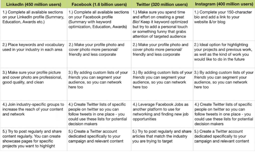 Below you will find a chart that lays out the four most used Social Media platforms. We provide you with some tips and tricks to make your profiles stand out, and gain more traction.