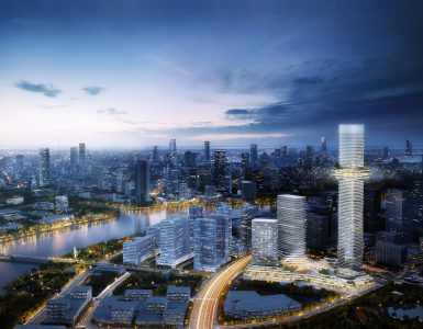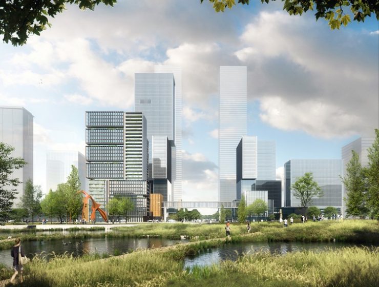 Taking advantage of the surrounding natural assets, such as the Central Park planned at the core of the master plan, the Xiao Zhangjiabang River to the east and the wetland park to the south, the design organizes five towers in an open and integrated network of urban gardens. ” – Archdaily