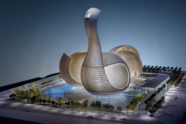 “The Safdie Architects entry for the Abrahamic Family House competition located in the Cultural District of Saadiyat Island, in Abu Dhabi, brings together a mosque, a synagogue and a church within a shared public park.” – Archdaily