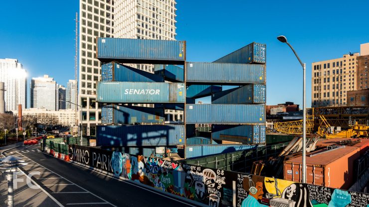 “The LOT-EK Triangle Stack # 2 project is now open at Domino Park in Brooklyn. Designed for the Brooklyn Museum to allow an urban-scale mural by artist JR, create an instant public space, the 60-foot triangular courtyard opens to the city and the sky” – Archdaily
