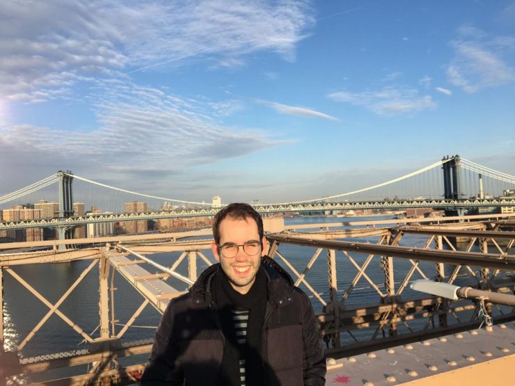 When I came to visit those bridges, I decided to cross the river by walking on the Brooklyn Bridge and, before arriving in the middle of its span, I didn’t realize the Manhattan bridge was so close. In the picture above, you can see me on the Brooklyn Bridge and the Manhattan bridge right behind. Although it was a sunny day, it was quite windy and that’s why I’m wearing my jacket. After living more days in NY, I realized the wind in here gets the day much colder. Well… at least that’s what it feels like.