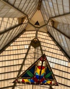 Beth Sholom Synagogue, is a completely different architecture of Frank LLoyd Wright, located 13 miles (20 km) North of Philadelphia. The Synagogue was finished years later, in 1959, just months after Wright’s death. It’s the only synagogue Wright built in his career. Before he engaged in a six year collaboration, Wright made it clear that he would not design a ” Jewish synagogue”, but ”an American synagogue”, as a temple for the Jews, who lived in America. Although, the exterior of the pyramidal building was often compared to a spaceship, the interior sanctuary stands out for its wide and luminous atmosphere that came through the pyramidal glass tower. Wright wanted the congregants to walk in and feel ”as if they were resting in the very hands of God”. There comes one of the main problems of a roof made of glass, which are the leaks, often found in Wright’s buildings. As well as in his other buildings, it’s common to see furniture designed and placed in purpose, such as flower pots, lamps, or different metal plates of the floor plan represented around the building.