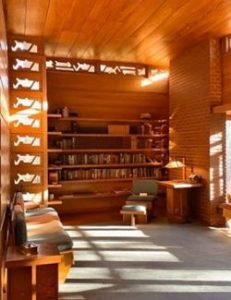 Some of the innovative concepts used in the design of the house were the corner windows and the low cantilevered roof at the entry, which creates a space that could be used to protect the car from the weather, therefore not requiring a garage. One of the characteristics of the house is the horizontality, something common on Wright’s architecture. Its beauty resides on the relation with the nature, the presence of natural light, as well as the way the architect mastered the combination of the wood and brick, function and form, and the care of the details that are very characteristic in Wright’s architecture. Some of the details, such as the folding wardrobe doors are impressive for a house built in the 1940s. The open space or open floor plan is also common nowadays, but revolutionary during those times. The house came with the design of every single space and its furniture. Highlighting the bookshelves with the wood lamp, the fireplace, the dining area with a lower hight connecting with the exterior, especially the natural light and overall details that made it a passive house. We visited the house during Thanksgiving break, when the colorful landscape reflected inside and outside the house in a gorgeous way.