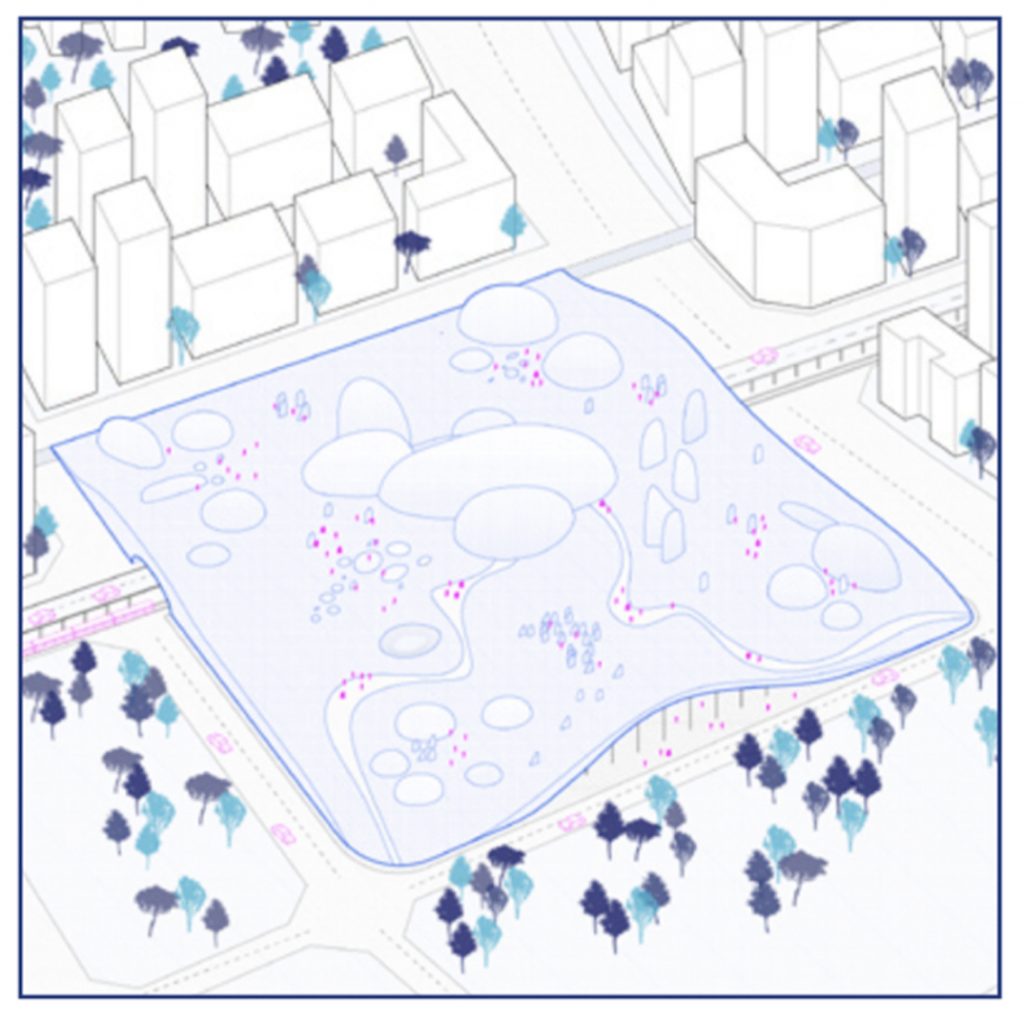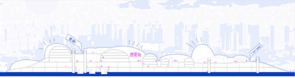 Poltavtseva added, “Shiny blue hills, glowing mountains and smooth rocks softly rise on top of Xi’An Station. When visitors arrive, they suddenly land into the center of this hill, move up and exit in the middle of the blue surface looking at Xi’An skyscrapers from a new perspective. This is perspective of a city of the future, where Xi’An is not just known worldwide for its culture and history but also as a symbol of technological progress. Nonetheless progress does not come without drawbacks. Objects created by humans are damaging the nature, filling forests, seas and mountains with waste. Therefore, an artificial landscape is created on top of Xi’An train station. Rocks, pebbles, islands made out of recycled plastic materials give shape to an imaginative nature without affecting the existing one. This is how the landscape of the future will look like, born from the combination of the familiar language of the nature and anthropic materials.”