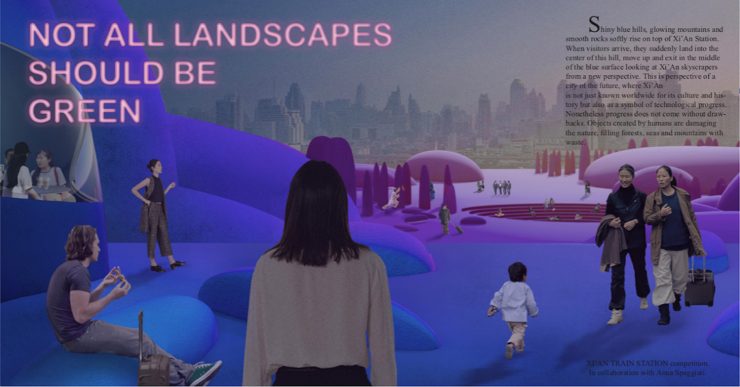 Poltavtseva added, “Shiny blue hills, glowing mountains and smooth rocks softly rise on top of Xi’An Station. When visitors arrive, they suddenly land into the center of this hill, move up and exit in the middle of the blue surface looking at Xi’An skyscrapers from a new perspective. This is perspective of a city of the future, where Xi’An is not just known worldwide for its culture and history but also as a symbol of technological progress. Nonetheless progress does not come without drawbacks. Objects created by humans are damaging the nature, filling forests, seas and mountains with waste. Therefore, an artificial landscape is created on top of Xi’An train station. Rocks, pebbles, islands made out of recycled plastic materials give shape to an imaginative nature without affecting the existing one. This is how the landscape of the future will look like, born from the combination of the familiar language of the nature and anthropic materials.”