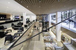 The main lobby immediately informed that the architectural language was different from the main building. The materials palette changed. Steel, wood and charcoal paint and furniture combined with the accentuated vertical lines of the reception counter and staircase turn it into a sophisticated reception space. This was one of the intentions of the architects, who beautifully connected the double-height lobby to the store in the lower level.