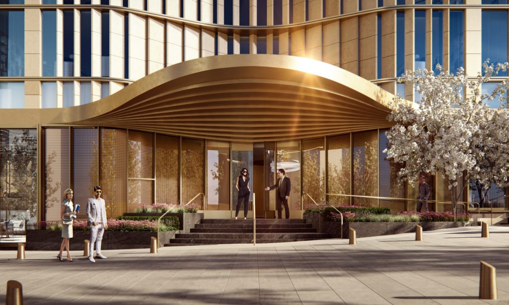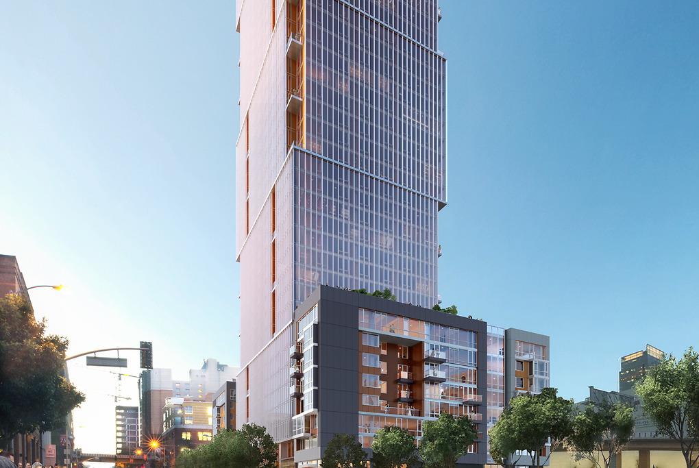 The centerpiece of the district is 500 Folsom, a 42-story residential tower strategically sited adjacent the Bay Bridge offramp where it welcomes visitors arriving from the East Bay. Rising in a series of stacking volumes and topped with a unique terracotta crown, the tower is an iconic and distinguishing presence in San Francisco’s multifaceted skyline. The building features 428 market-rate units, 109 below-market-rate units, residential amenities such as a spa and indoor-outdoor recreation areas, and 289 below-grade parking spaces.