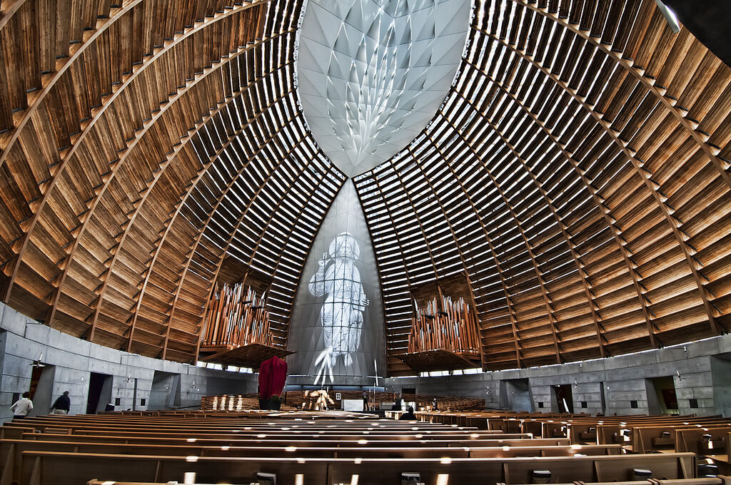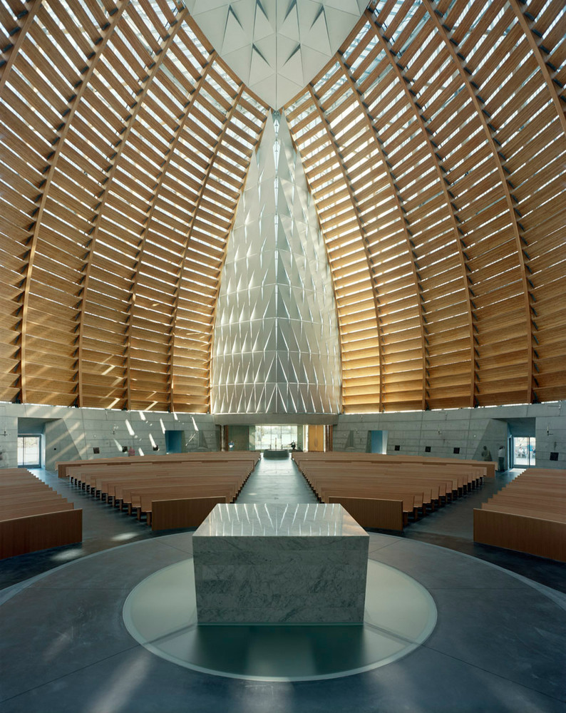 From the very beginning, the lightest ecological footprint was a core design objective. Through the use of renewable materials and other sustainable design strategies, the building minimizes the use of energy and natural resources. With the exception of evening activities, the cathedral is entirely lit by daylight to create an extraordinary level of luminosity. The structure’s concrete makes use of industrial waste fly ash, a by-product of coal production that requires less energy to produce than cement. The reuse of this material provides a better adhesive while reducing waste. An advanced version of the ancient Roman technique of thermal inertia maintains the interior climate with mass and radiant heat. Through displacement heating, small ducts beneath the pews cool the building from the floor.
