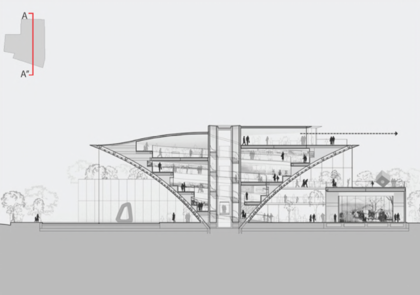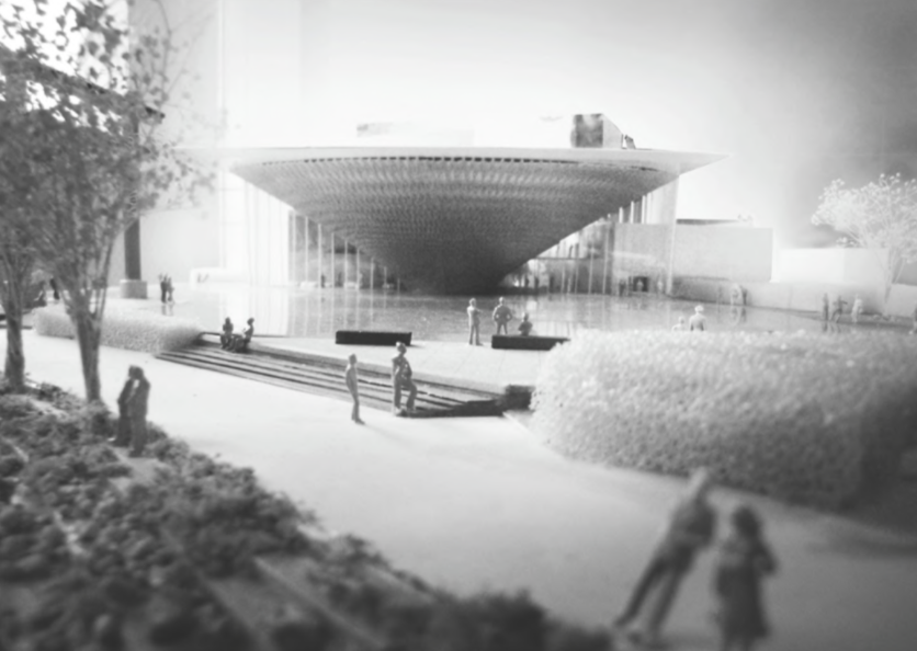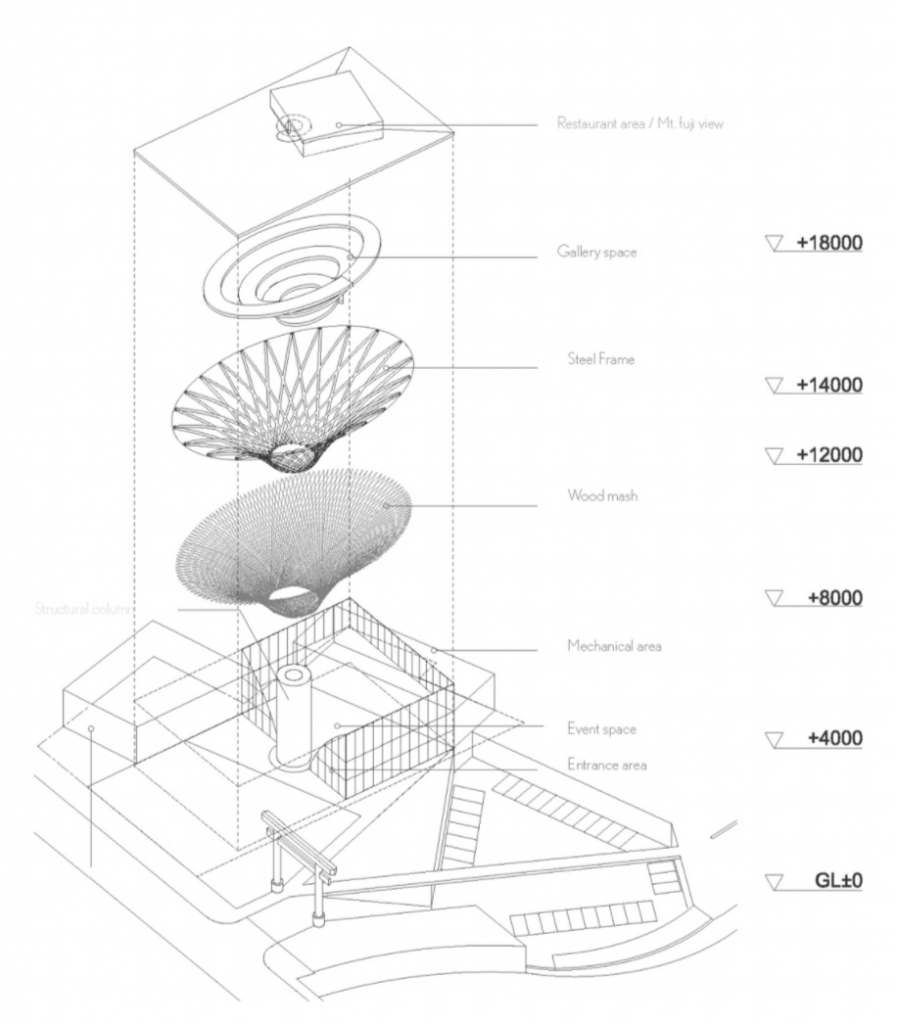 Bianca emphasized the importance of properly reflecting the Japanese Heritage that is tied to the grand Mount Fuji. For many Japanese it is a spiritual place that represents generations upon generations. She tries to provide a balance counter-balance to the Mountain, and it is for this reason that we see a funnel like shape that represents Mount Fuji, but inverse.