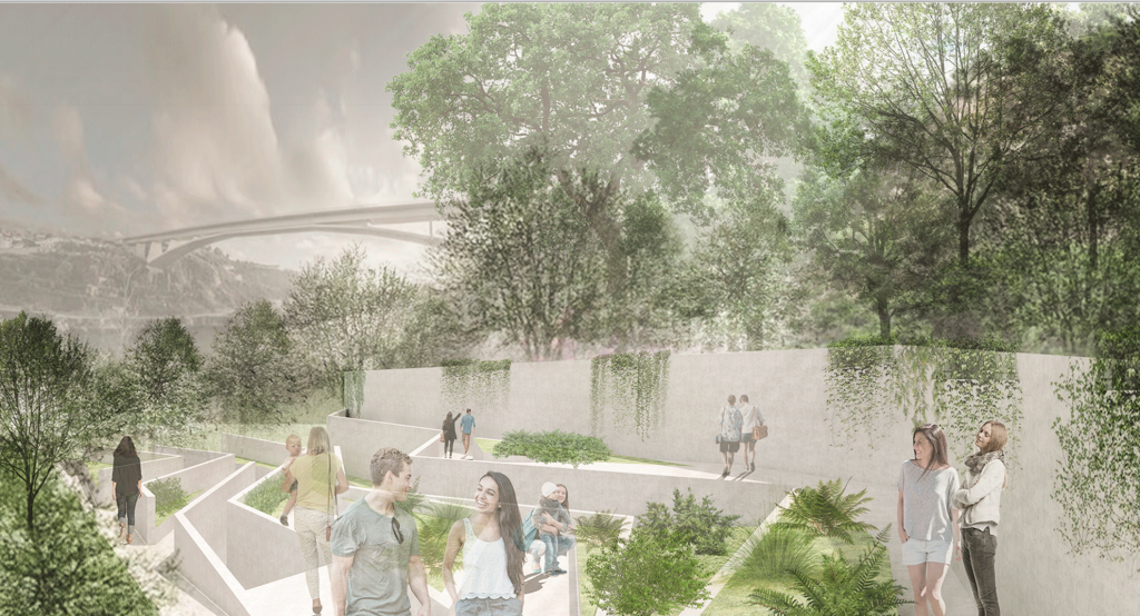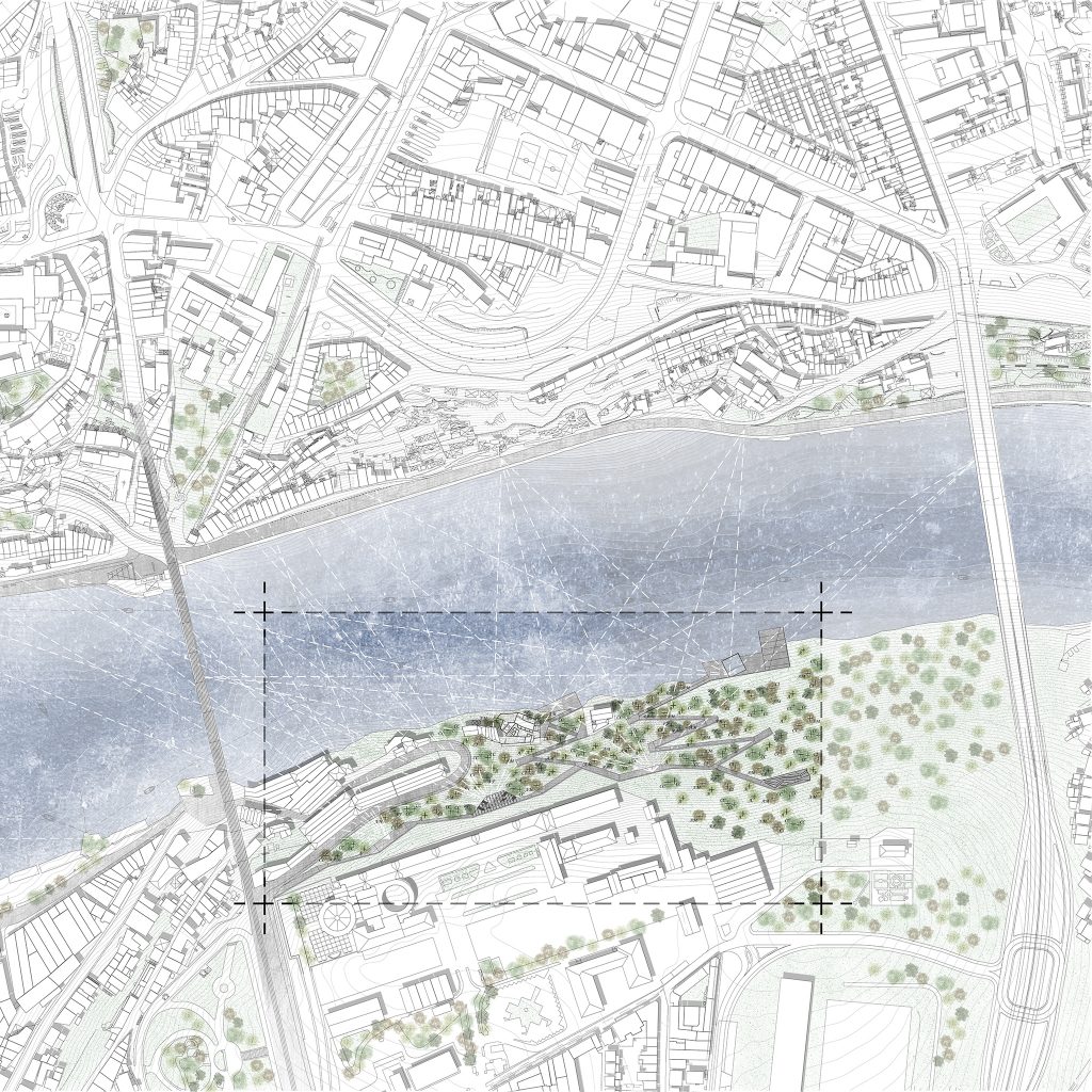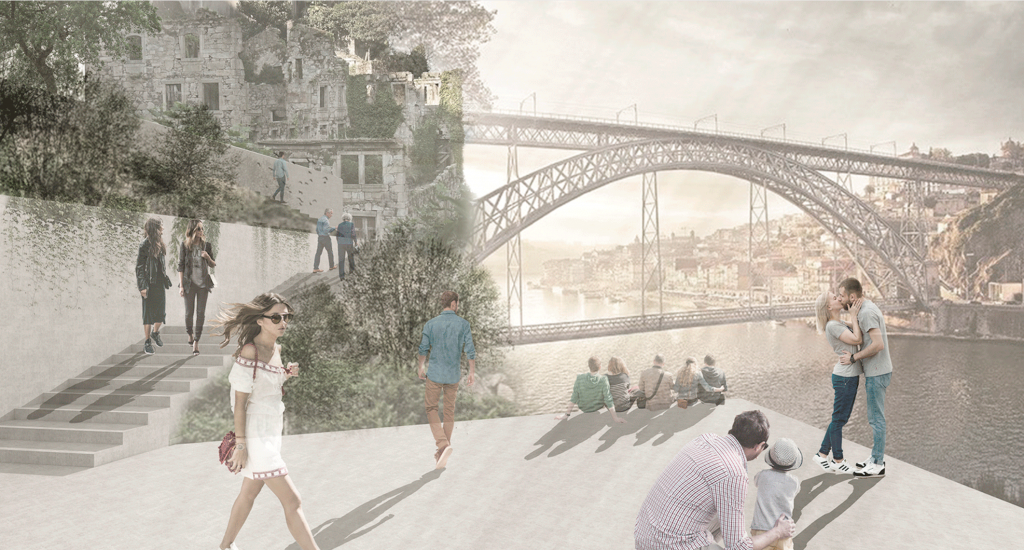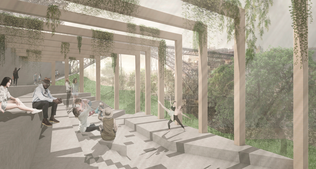 The design is placed on the bank of the river Douro as it flows through Porto. It acts as a suture, continuing the riverside walk, regenerating the landscape, sewing up the pre-existing, creating new public spaces and bridging a difference in height of more than 80 metres. The natural environment, the pre-existing constructions and the new implantation are no longer conceived as three differentiated components but as one.