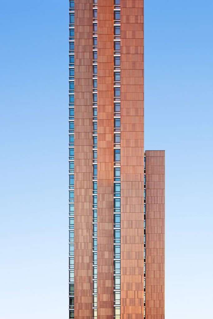 Drawing from the industrial heritage and artistic spirit of Long Island City, the Forge is clad with a warm, vibrant mix of materials including anodized aluminum, which lends texture and dimension alongside glazed expanses. The building culminates with a rooftop deck that begs the question: What’s better than being in Manhattan? Enjoying views of its skyline silhouetted against a sunset.