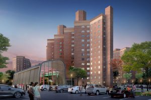 The Gerald J. Carey Gardens development includes three high-rise residential buildings on three adjacent city blocks in Coney Island, Brooklyn. The fifteen-story buildings have a total of 682 apartments. One of the residential towers shares a lot with a Community Center, which houses assembly spaces, classrooms, and a childcare center.