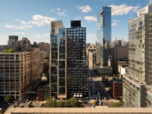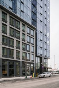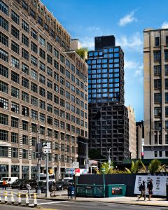 S9 Architecture sought to celebrate New York City’s venerable and varied architectural precedents with the building’s design. 111 Varick’s stepped massing evokes the classic setbacks found on Gotham’s early skyscrapers, while the facade stylishly reinterprets the industrial aesthetic of the loft buildings nearby. The gridded fenestration pattern and a palette of industrially-inspired materials such as glass and blackened steel echoes the buildings in the surrounding vicinity.