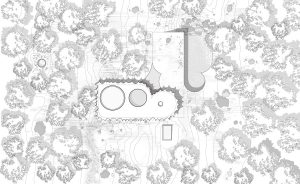 Taking cues from the existing surrounding landscape, the Guest House is designed around the natural clearing and its two distinct trees. The building is a series of 4 identical mirrored suites unified under a single roof. The suites’ rotating orientations alternate the views of each suite to align with one of the two trees. While the trees provide reference points to align the suites, the center of the clearing serves as the center of the arc of the roof that curves around the edge of the open space. The shaded areas between the rotating suites create shared outdoor spaces for the retreat’s visitors.