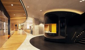 The interior architecture, pretends to create a visual distortion of the space by curving a consecutive rib structure from the concierge area up to the restaurant side. The goal is to create a contrast in materials and the geometry of the space, organizing the program without dividing the areas. Instead of walls or division elements, materials application acts as a space and program divider.