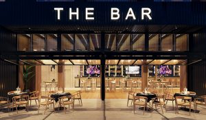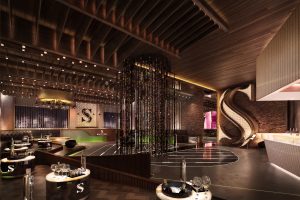 A long and narrow space hosts several functions as a bar, restaurant, cinema concierge services, etc.