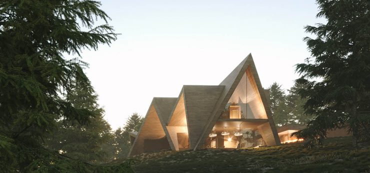 The design has been presented for Colorado Villa, a 600 square meter vacation home is located in the heart of the Rocky Mountains that reinterprets the A-frame typology in the Colorado Rocky Mountains. The design team decided to adopt the triangular house typology in a more complex play of volumes, creating a multifaceted spatiality with an increasing level of privacy on the upper floors.