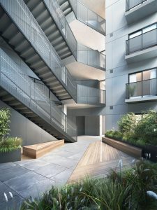 Given the size constraints and through-block nature of the parcel, Edmonds + Lee developed a scheme in which the building has two main masses with facades on Grove and Ivy Streets, with an internal courtyard carved out in the center to allow light to flood all the interior spaces. The courtyard serves as common outdoor space, as well as housing an open stair that serves as a major part of the main circulation system. That stair brings a vibrancy and liveliness to the courtyard, integrating it with the natural rhythm of life in the building.