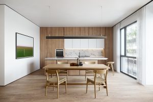 The stair was conceptualized as a hinge, both marking the joints between floors and bringing together the traditional craftsman architecture on the street side of the house and the sleek, modern spaces in the back. An honesty of materials undergirds the new design, whose sleek, white interiors are punctuated with swaths of warm oak and Carrara marble. In the kitchen, a large central island of thick, weighty timber recalls the craftsman tradition that runs through the home’s veins.