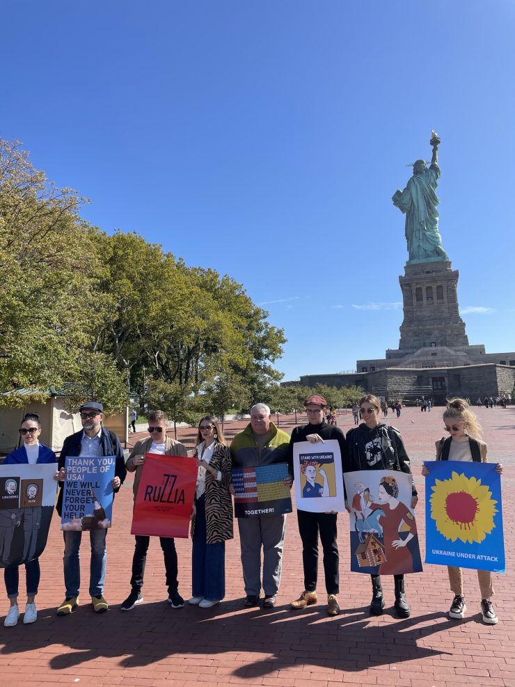 Finally, I had a good reason to go there. On October 15th, together with the Ukrainian community in NYC, we hopped on a ferry to Liberty Island. Once we arrived, we gathered in the center square of the island and pulled up Ukrainian flags, symbols, and a banner saying ‘Defended by soldiers.’ It was around 30 participants, photographers, and a special guest was Oleksii Holubov – Consulate General of Ukraine in New York. This action was dedicated to the defenders of Ukraine. Defenders Day is celebrated in Ukraine on October 14th.