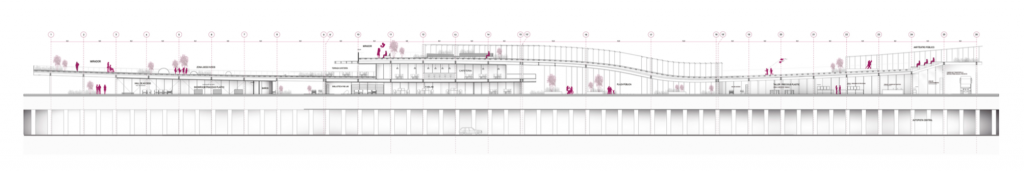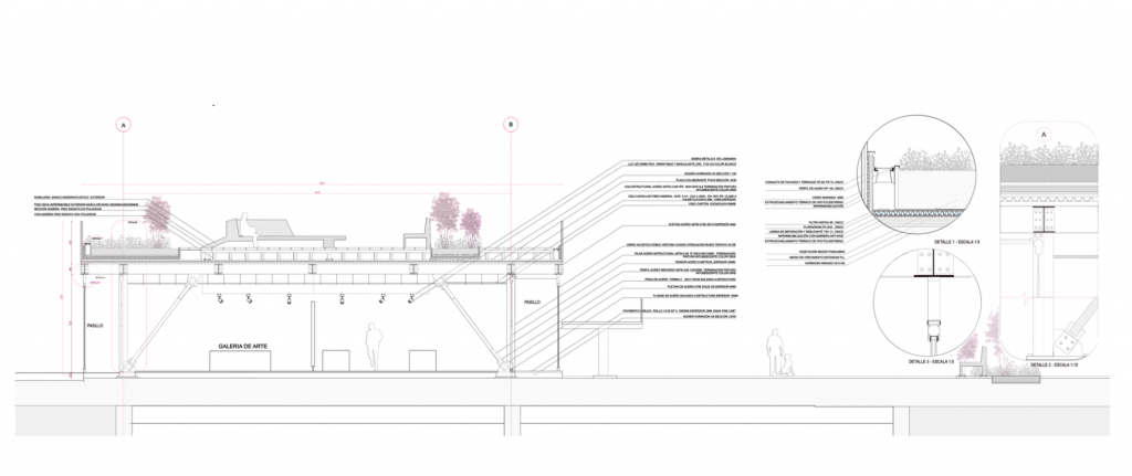 The project is located on a highway, so it has three different levels. First and second levels have recreational programs like art galleries, computer labs, artisanal workshops, a library for the community, and on the third level, there is an area for entertainment. Due to the high density of buildings in the area and the lack of recreational spaces, this project proposed aims to mitigate the negative impact of these large buildings surrounding the project.