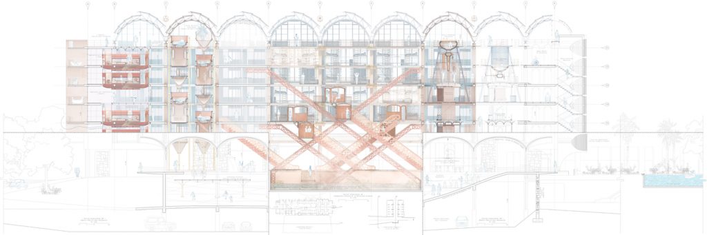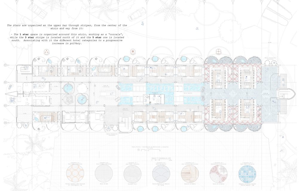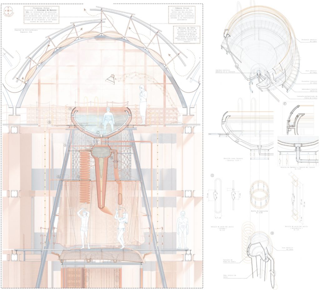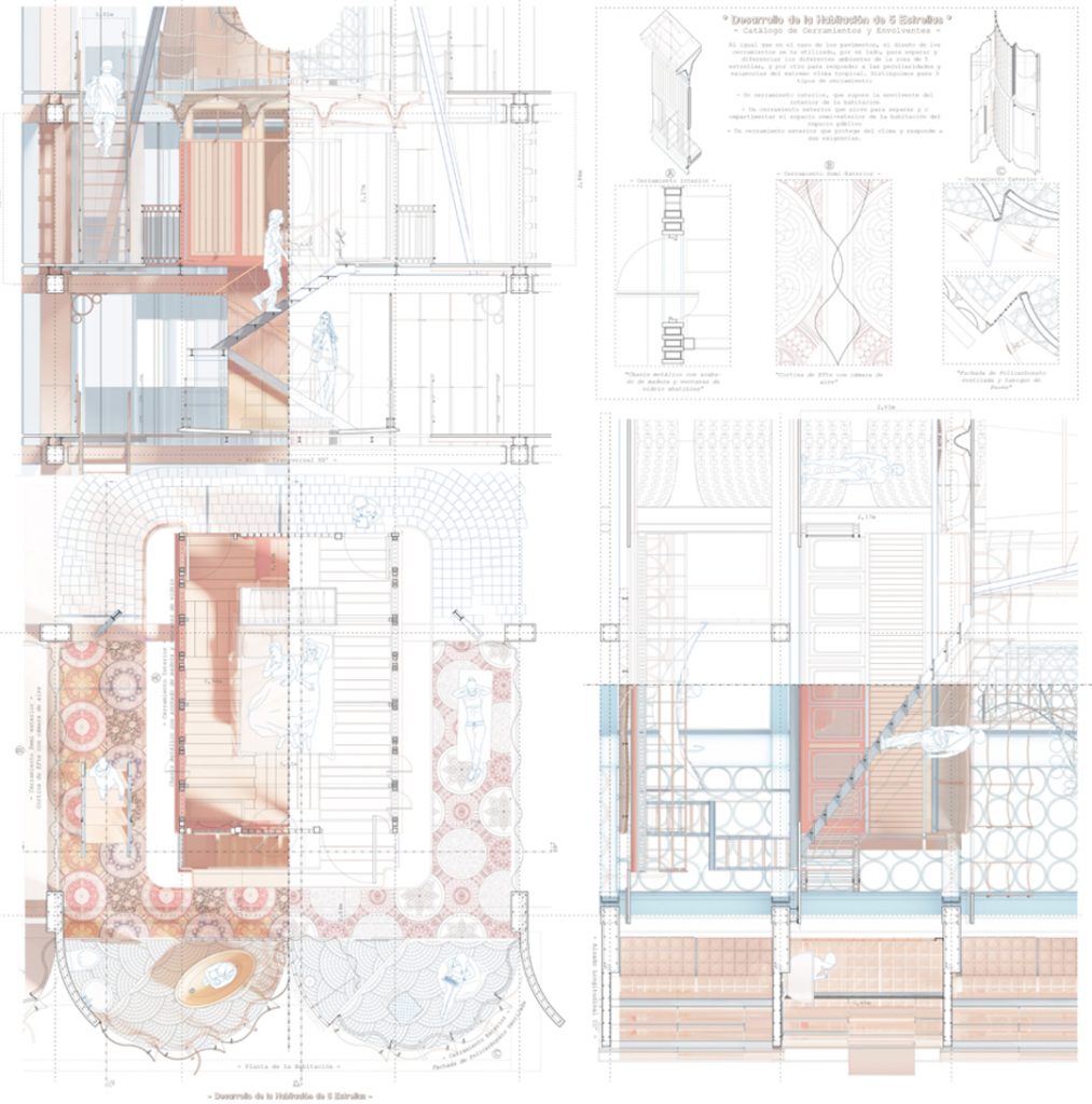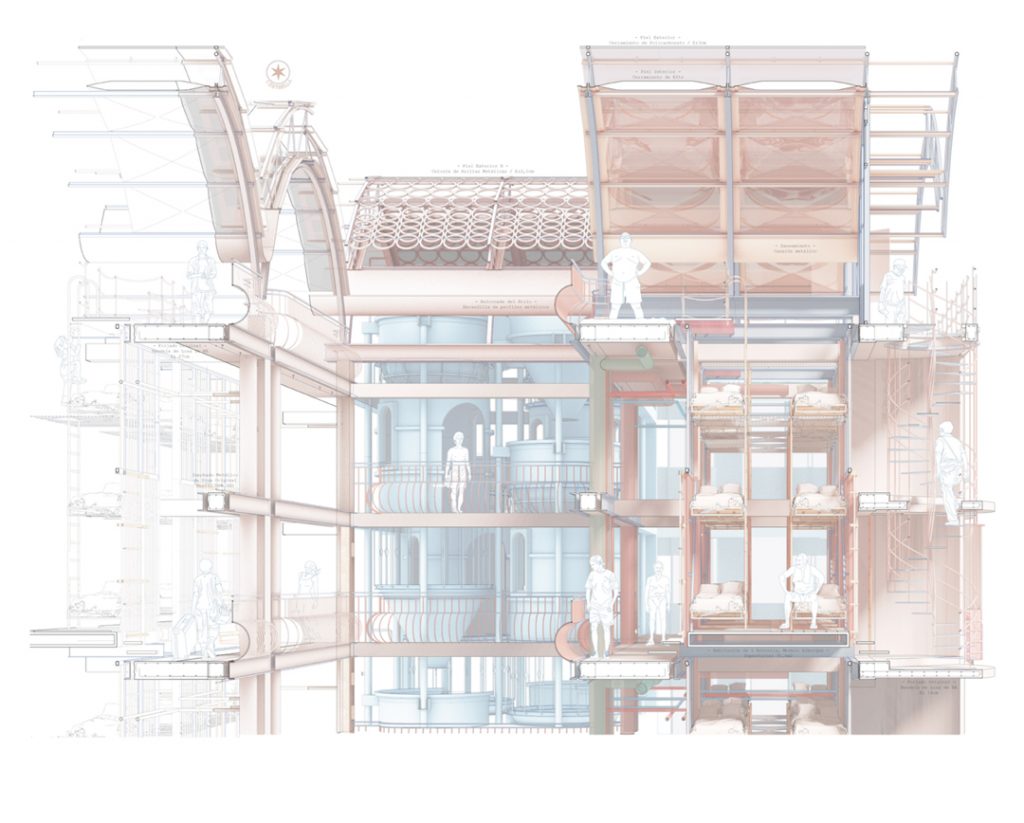 In the initial section you see how Luis provides us with his strategy to make the intervention in order to add more support to the different beams and structures that needed to be fixed and reinforced. The open spaces are enhanced and more spaces are added in order to make the space feel larger, and you can even see the design for the roof intervention at the bottom.