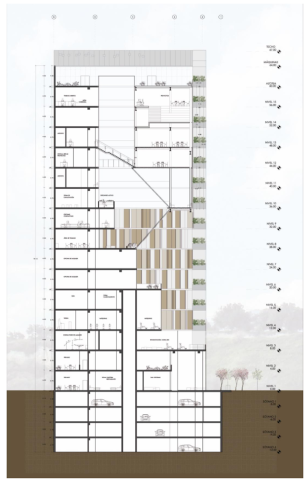 Gabriela Poblete is currently working at Trazzo Illuminación in Peru, and has been seeking the opportunity to work in the USA and push her career forward. In this project, she provides us with an idea of what a hybrid building could look like when incorporating green space within the structure, as well as sections dedicated to socializing. Not only this, but the design provides for a concert hall and exercising spaces that incorporate green space as well.