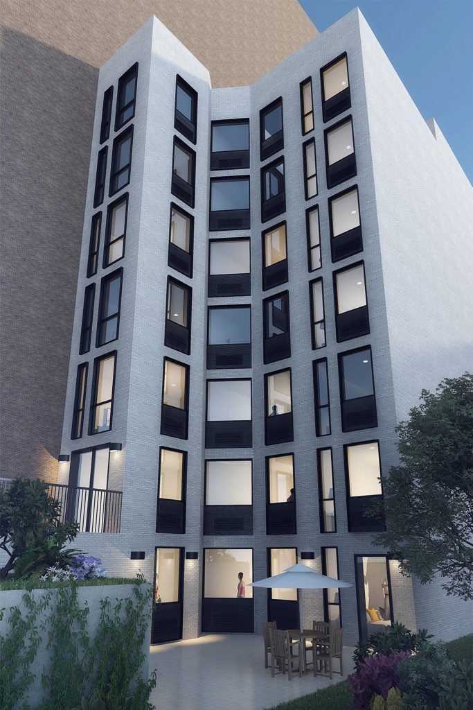 Located on Creston Avenue in the Bronx, this 25-family development rests atop a natural granite outcropping. The natural topography rises a dramatic 35′ in height across the narrow lot. The building’s mass negotiates the challenges of the site by avoiding disturbance to the existing rocky conditions. The design allows the project to remain affordable while adding beautiful natural elements to the building. The natural rock face cascading through the building’s entry portico creates a sense of separation and floating for the dwellings above.