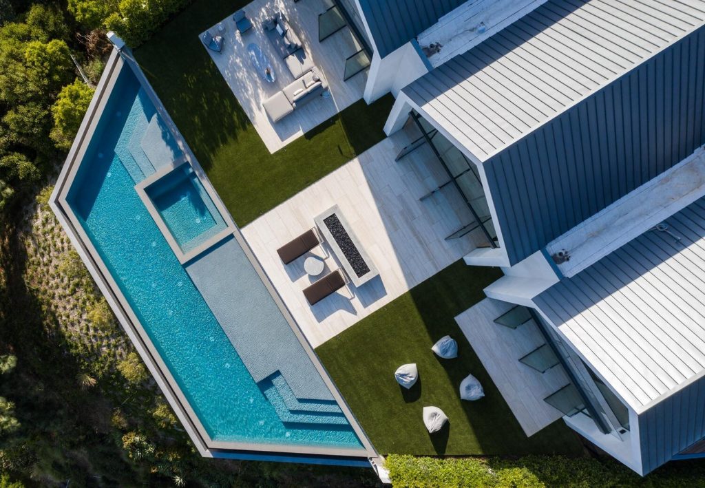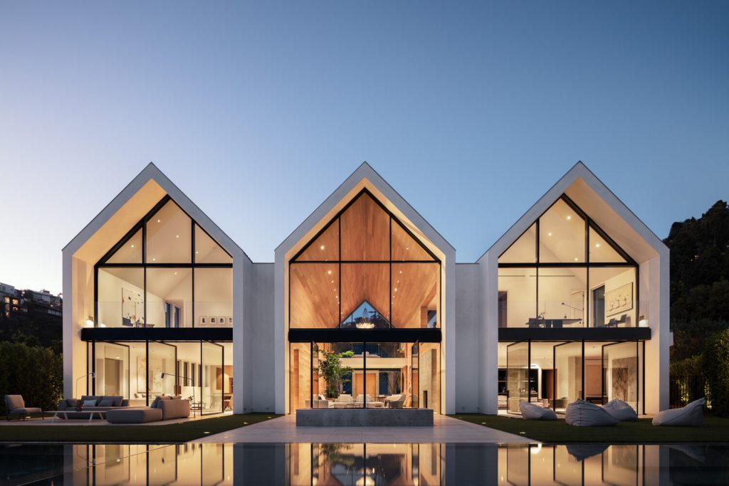 Inspired by Louis Kahn’s Kimbell Art Museum, the home takes the shape of three parallel gabled volumes with stairs between them. Each of these volumes houses different essential spaces and opens up onto an outdoor patio that overlooks the city, reinforcing the connection between home and landscape. The double-height middle volume, which houses an expansive living and dining space, was conceived by the architects as a singular great, big room. The pitch of its ceiling guides the eye toward the expansive glazing at the rear of the house, which opens up to the view over the city, at once providing shelter and inviting the outside in.