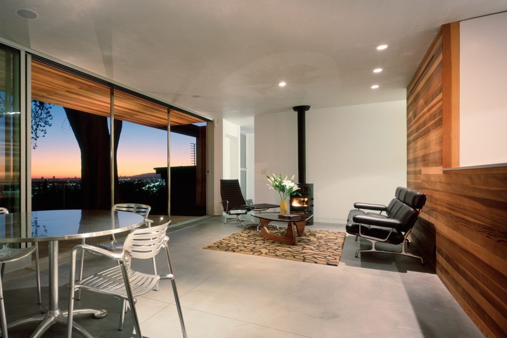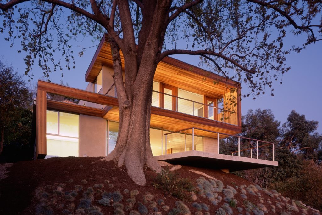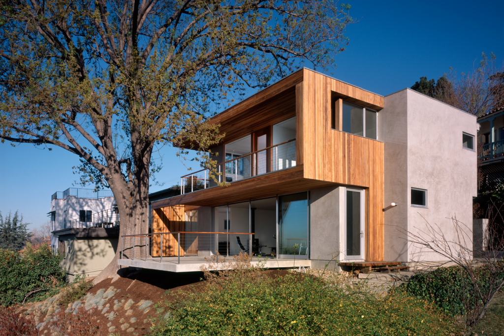 Perched near the top of a hillside in Los Angeles, this house responds to its site and the city through its transparent southern exposure. A large ash tree literally envelopes the house, creating a microclimate to which the project responds. The house employs passive solar design and other low-tech methods of climate control even as the open south elevation allows panoramic views of the Los Angeles basin.
