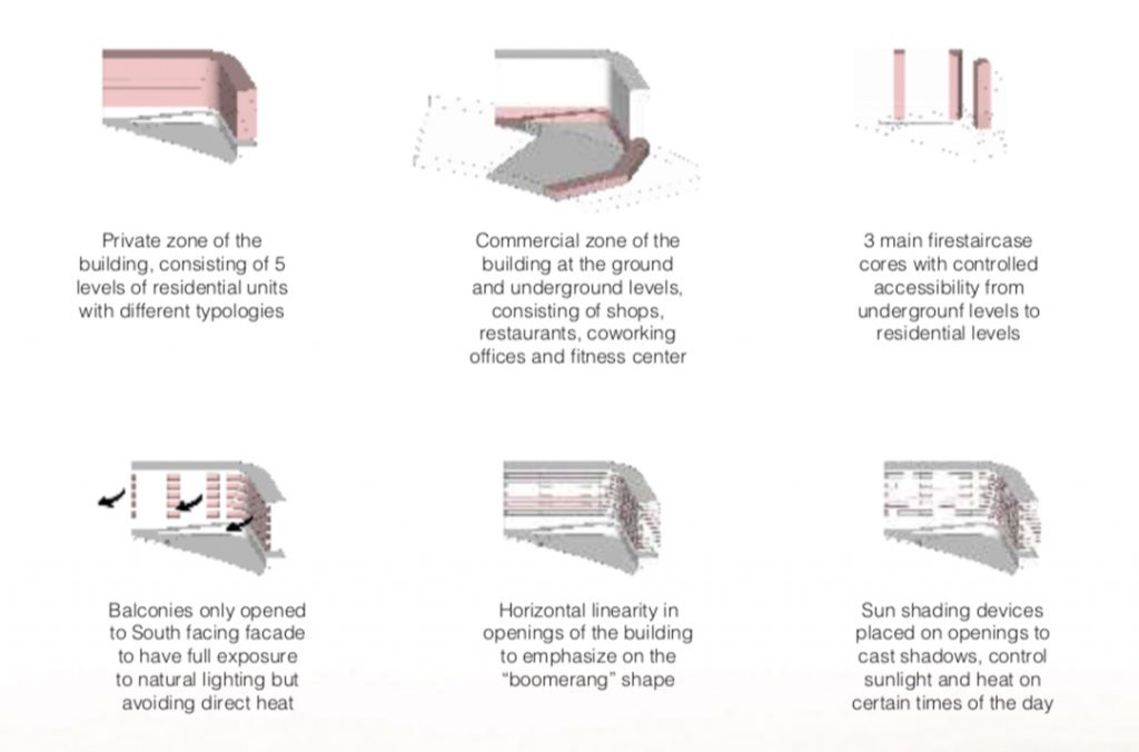 As you can see below, Fernanda provides us with insight into how she views each section of the residential building that seeks to connect the community through thoughtful design. Part of that design is the Boomerang aspect which is emphasized through the Horizontal linearity, and the balconies are placed facing the south of the building in order to create a full sense of the nature outside.