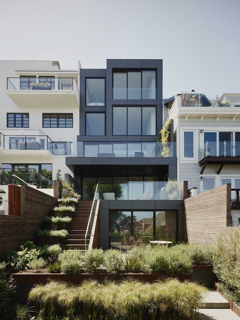Four-story massing usually leads to a space that feels tight or repetitive, so the architects worked to make the vertical circulation both evocative and valuable, forgoing the pancake-style San Francisco house, and instead opening the house in section, maximizing a feeling of spaciousness and a sense of architectural adventure. That meant a small sacrifice in terms of physically usable space, but a huge gain in terms of enjoyable architecture. Double-height spaces and a staircase centered within the central spine of the house encourage the clients and their visitors to engage with each level.