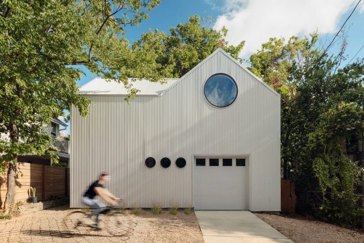 A new compact corrugated metal accessory housing unit has been unveiled in Austin. The project features a custom circular pivot window reminiscent of the round opening in a birdhouse. Called the Birdhouse, the 84-square-meter project wraps around trees to create a courtyard between the main house and provide privacy for the separate dwellings. It also shares a narrow 6,000 square foot lot with a one-story house and three large protected walnut trees.