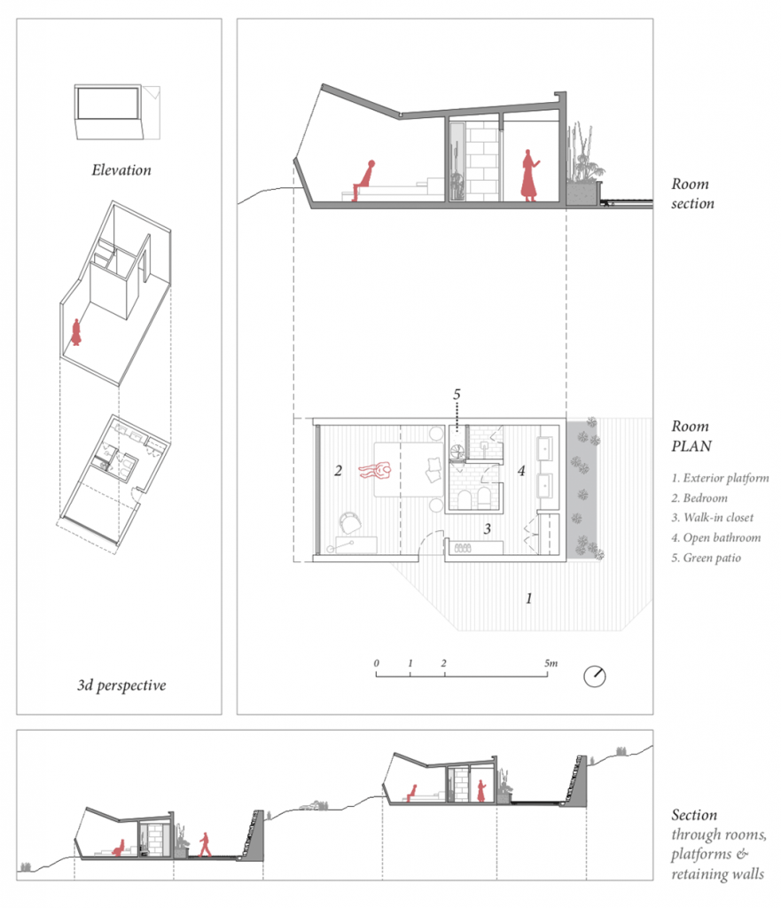 In this project, Guillermo tries to create a residential villa that is designed to blend into the natural structures around the project. As you can see below, he goes into detail showing how he would create the sense that the villa is part of nature, rather than standing out. With this mission in mind, Guille provides us with a breakdown of how the structures would be connected going from higher ground to lower ground, and he gives us an idea as to how the windows would be designed to allow for light in from a variety of angles.