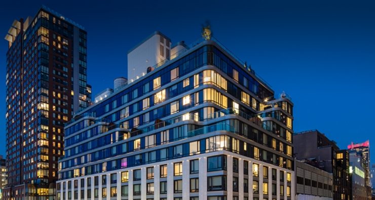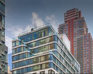 SYNOPSIS: Oskar, at 572 11th Avenue is a new 183,000 SF, 13-story modern residential complex located between 43rd and 44th streets near Hudson Yards. The program includes a 3,700 SF entry lobby and courtyard, punctuated by a sky-lit reflective pond, a wellness and fitness center, and a 2,500 SF indoor/outdoor terrace. The building exterior is designed with a terracotta rain screen. On the lower floors, punched windows set within a glazed white terracotta exterior form an angled bay to provide air flow within the building. Upper levels are articulated with a continuous window-wall with a metal slab edge accent. A series of indoor/outdoor terraces create green space and direct connections to the vibrant city life. The interior residences are bright, modern and flexible, with luxurious finishes that complement the architectural aesthetic.