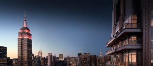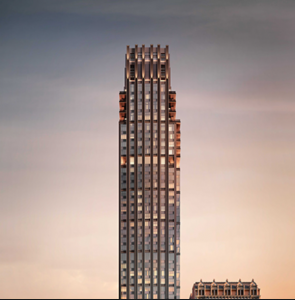 SYNOPSIS: Rose Hill, located at 30 East 29th Street, in the dynamic NoMad neighborhood, is a new 45-story residential building that pays homage to the Rockefeller legacy, the neighborhood and the city’s rich history of skyscraper architecture, while looking to the future. An expressive glass and metal façade sources inspiration from the Rockefeller Group’s landmark developments, namely Rockefeller Center, where exterior chevron patterns influence architectural elements throughout. Geometric accents, intricate details and expansive windows combine to reference a classically Gotham aesthetic, interpreted in a modern vocabulary.