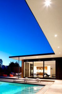 The design for the house negotiates the roof geometry between the front façade and the three rear facades that define exterior spaces for the pool and deck. The compact and linear front façade maintains a low horizontal profile, with a roof line that rises eight feet above a monolithic concrete foundation. Upon entering the house, a series of folded ceiling planes slope upward to full-height operable windows facing the south (pool) and west (deck). The ceiling geometry guides views toward the exterior living areas while allowing an abundance of natural light to enter the house. The roof line surrounding the deck and pool holds a second, higher horizontal datum 12’ above the foundation line.