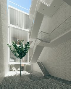 Their proposal challenges the traditional approach to structuring small lots with a long and narrow configuration. They suggest revisiting the zoning to reconsider the rear setback of the property line. That will allow them to create a central void, a courtyard of sorts, at the heart of the building, splitting the building in two volumes. This open space will bring light, ventilation, allow vertical circulation and supply a safe and controlled recreational space for all dwellers.