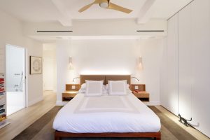The layout, makes a clear distinction between the public and the private spaces of the apartment, with bedrooms hiding behind «secret doors» consisting on a 10-foot floor to ceiling pivoting frameless panel. On the other hand, the public space needing to be recognizable, is strongly marked by one axis creating a free-floating public space from the North to the South end of the apartment while adding more privacy between the vestibule and the living room through a prominent art wall and custom made millwork reinforcing its presence to the client’s pieces.