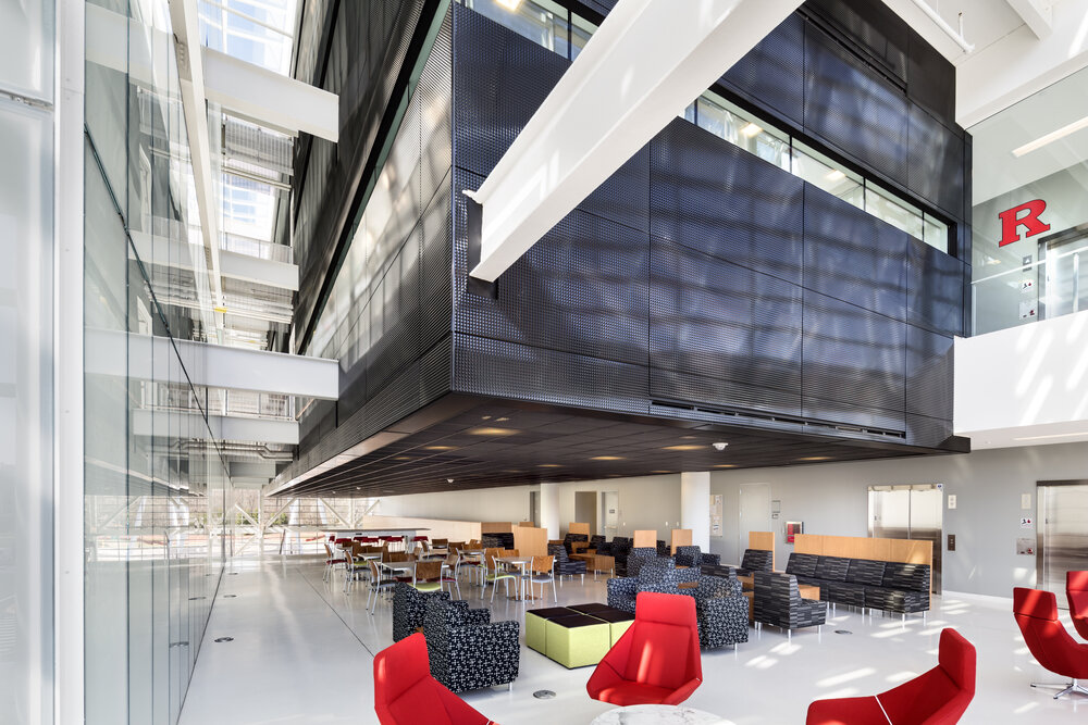 After winning the 2007 competition to develop a new master plan for Rutger University’s College Avenue Campus. In 2009 and as part of the first phase of the project, the construction of a new graduate and professional development campus began in Livingston for which the Rutgers Business School of approximately 14 thousand square meters was designed and built, inaugurated in 2014. With an architectural program delineated between the rapidly growing university and the adjoining ecological preserve, the L-shaped building acts as the entrance to the campus, while its interiors are connected vertically by a large atrium and horizontally.
