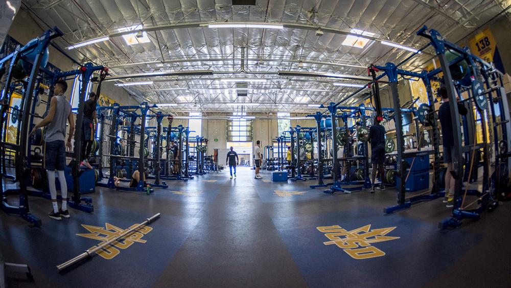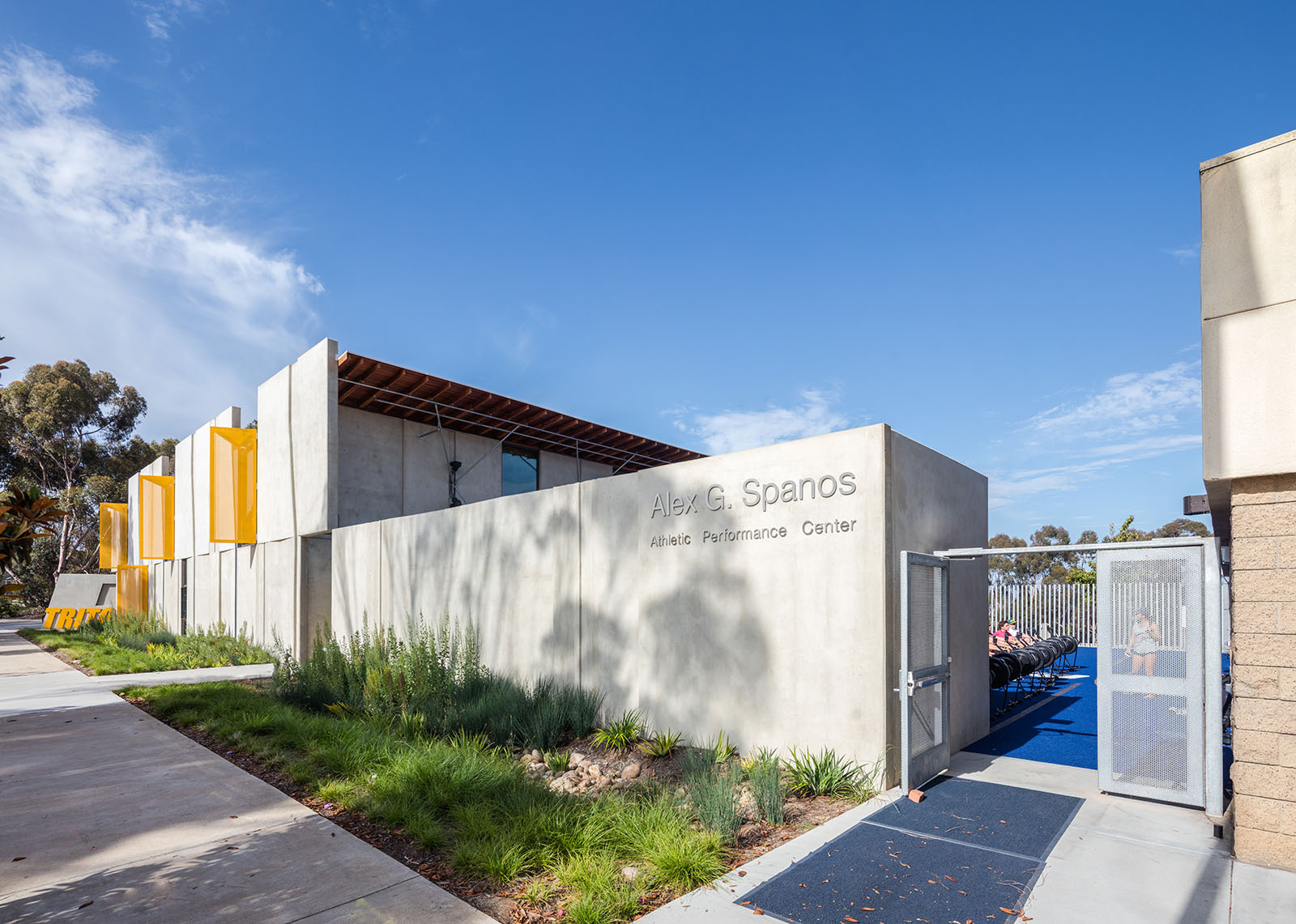The new UC San Diego Triton training center flanks an open-air exercise courtyard linked to an existing structure. Enclosed within a strength and conditioning area are tilt-up concrete walls with patterns. The facility’s dynamic nature is suggested by the windows’ rhythmic arrangement, the concrete reliefs on the facade, and the articulated sloped roof.