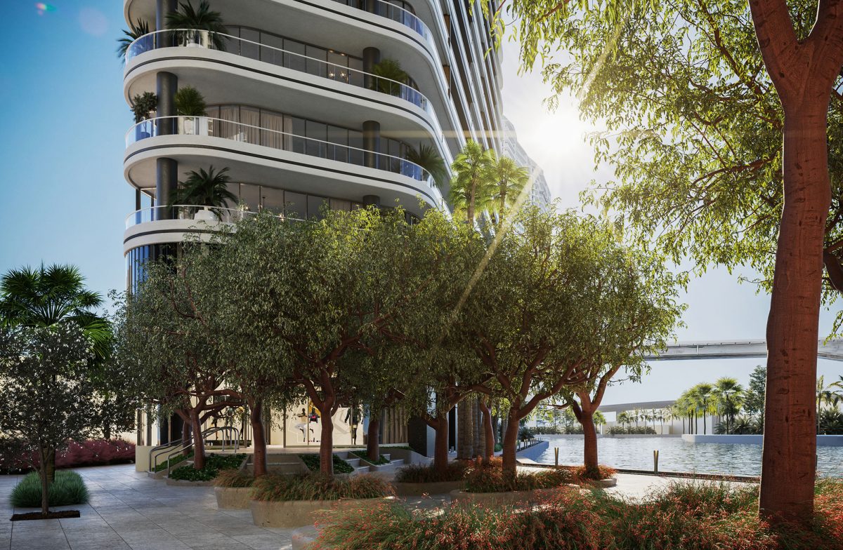 Brickell’s “super tall” residential complex, Two Riverside, is situated on the Miami River waterfront. In addition to connecting and extending the current public riverwalk west of the site and enabling it to pass beneath Miami’s well-known “Underline” linear park where it meets the river, the project extends the Miami River Walk along its whole frontage. At each end of the site are two landscaped, publicly accessible urban plazas that are home to White Tabebuia and Gumbo Limbo trees that provide shade, enhancing the Brickell area as a whole.