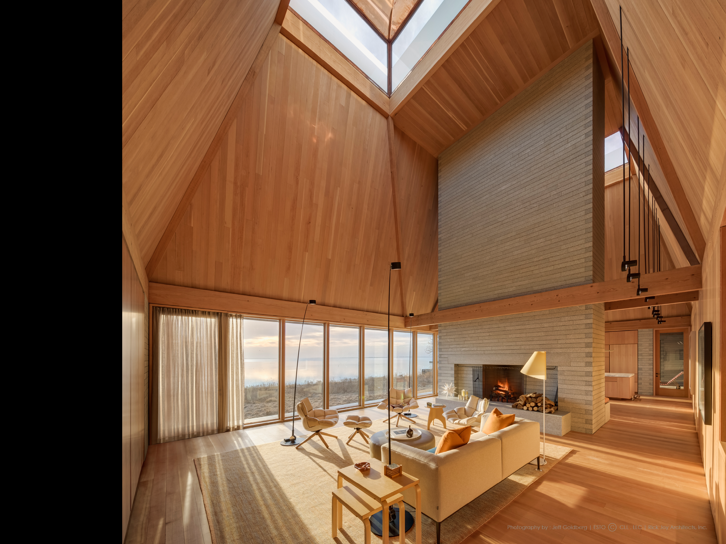 Peach to pink hues of daylight flood the spacious room from the cathedral-like high ceiling in the living room, dining area, and kitchen, which is divided by the wood-log fireplace and terminated by two copper-lined belvederes. CLL chose to illuminate the extended interior hall and back wall with light in order to maintain this roomy area during the evening and night, as well as to guarantee visual comfort. They were able to bridge the high ceiling drop, bring the light close to the wall and artwork, and take advantage of the best color rendering capabilities thanks to Zumtobel Group’s suspended stem wall-washers.