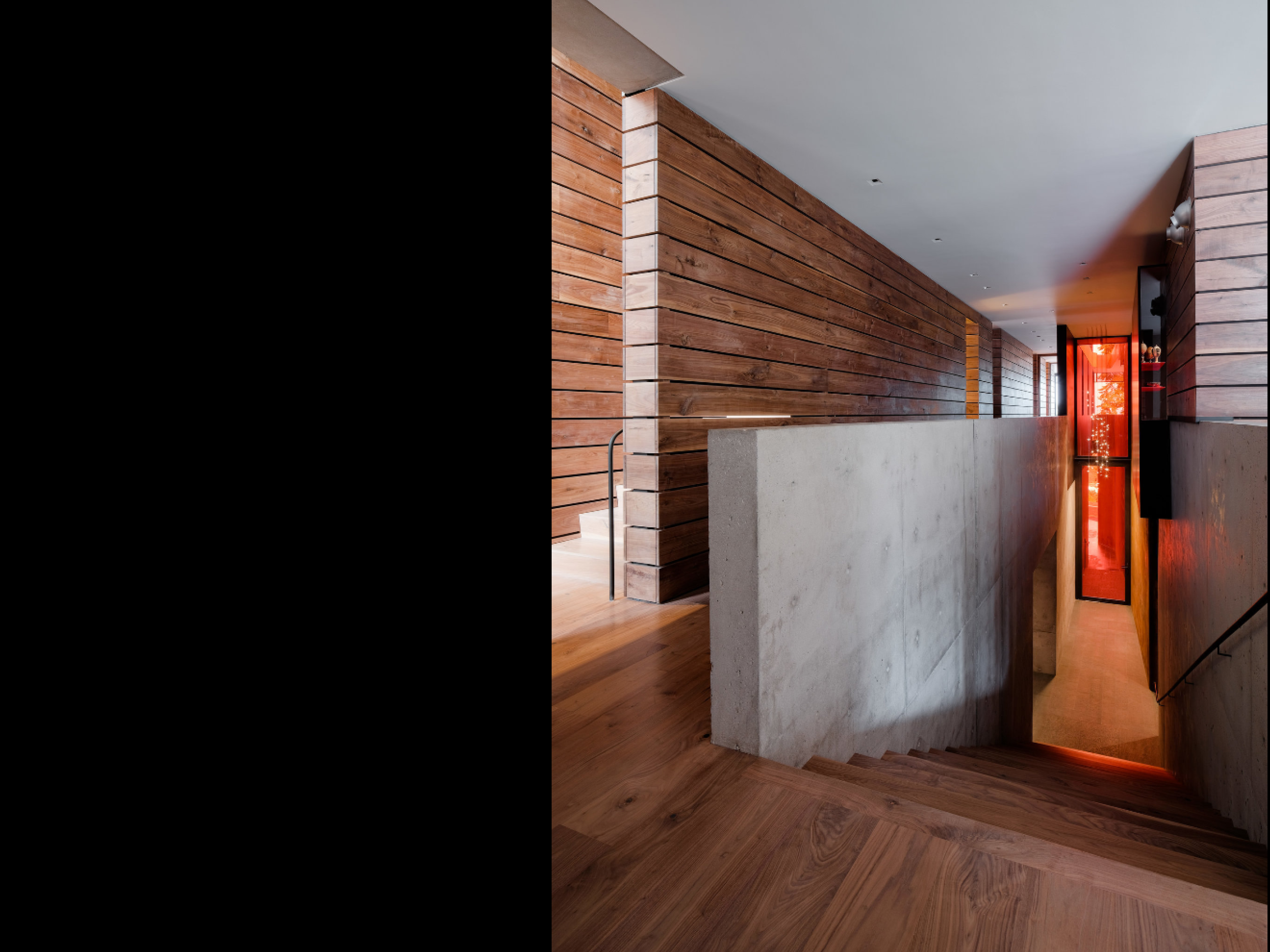 Drawing inspiration from the volcanic stone known as basalt found in the area, the house features bursts of red accents that lift the spirits and create a cozy atmosphere. The hidden entrance has a three-story red glass wall that extends from the lower level to the master level above, past a double-height entry and stairway. Here at the entrance, a Catellani & Smith sparkling chandelier greets visitors with awe and conjures up memories of the splendor seen on the slopes on a clear winter morning when the sun hits the floating crystals and causes them to dance in the sky.