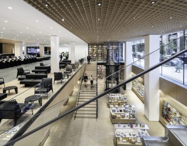 A new residential high-rise designed by Hill West Architects has been completed in Brooklyn. The project, called Olympia Dumbo, is shaped like a sail and is located next to the Brooklyn Bridge. The tower rises 122 meters high and has 33 stories. It is wedge-shaped and sits on an angled podium. The building’s fan-shaped base mirrors the curve of a nearby exit ramp at its rear. The opposite side is set back from the street and houses the main entrance.